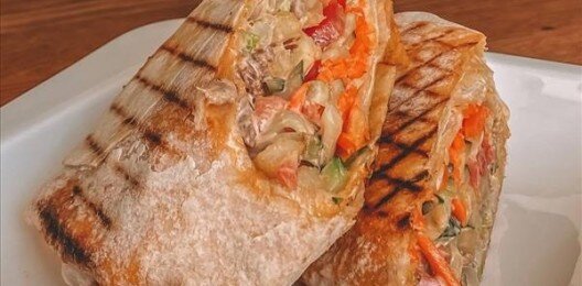 В лаваше с сыром моцарелла, с укропом и белым чесночным соусом, со свежими томатами, огурцом, листом салата, болгарским перцем и красным луком
