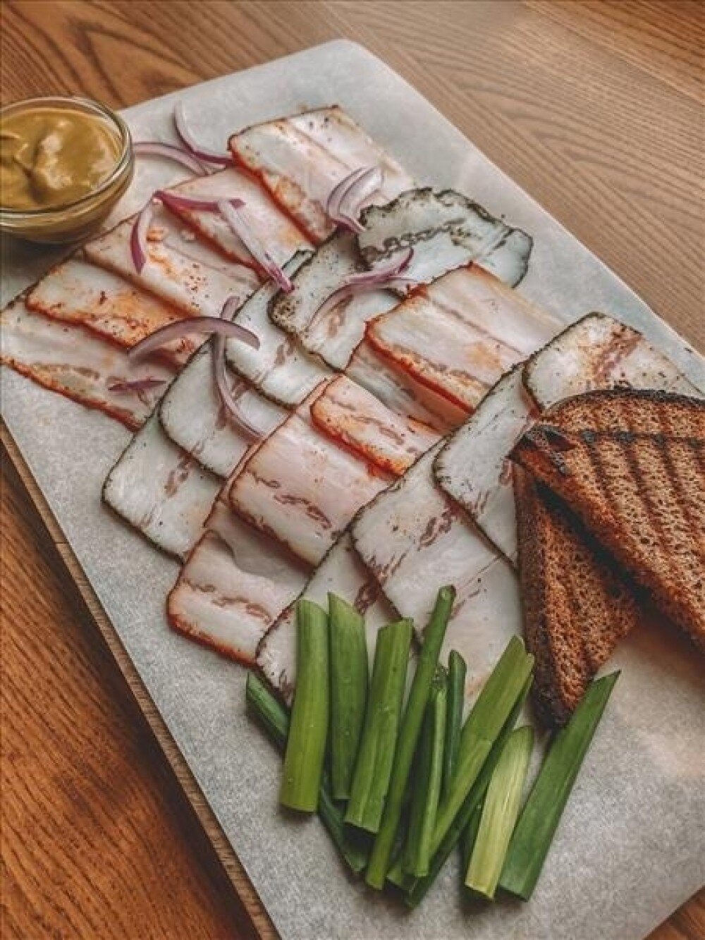 Сало с горчицей и бородинским хлебом