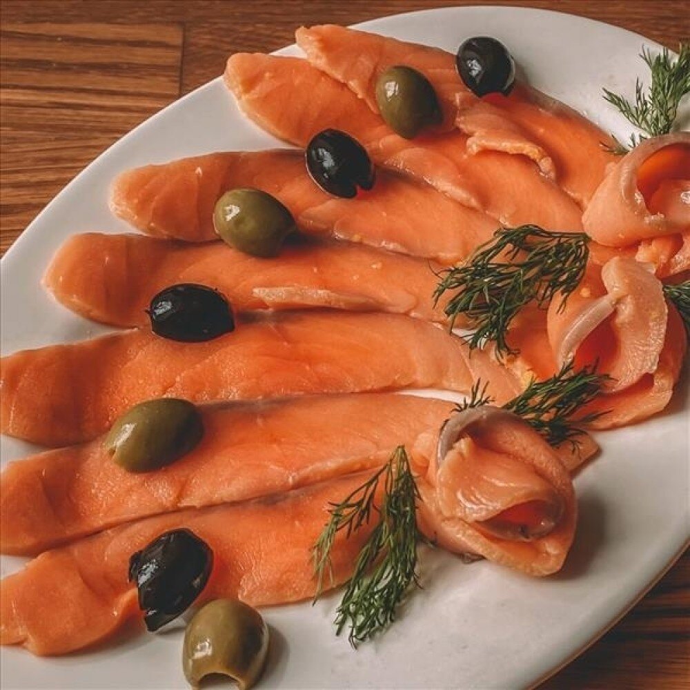 Подаётся с оливками, маслинами и долькой лимона. Украшается зеленью. 150/30 гр.