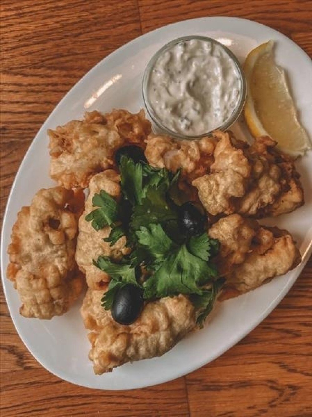 Подается с соусом «Тар-тар». Украшается маслинами и долькой лимона.