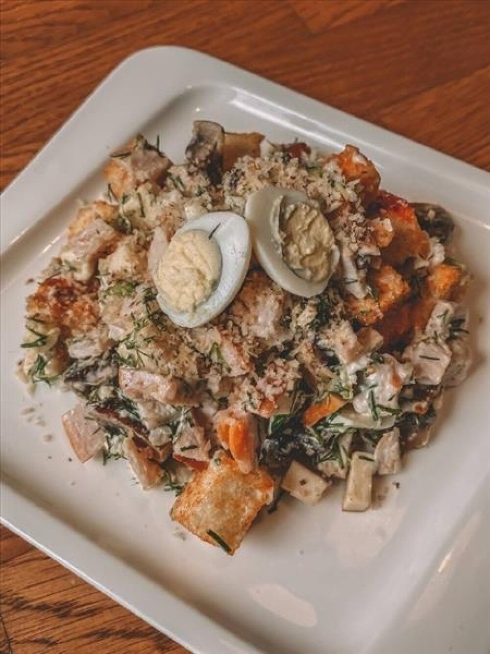 Копченное куриное филе, копченный сыр, жаренные шампиньоны, яйцо куриное, сухарики. Заправляется соусом на основе майонеза. Украшается перепелиным яйцом и измельченным грецким орехом