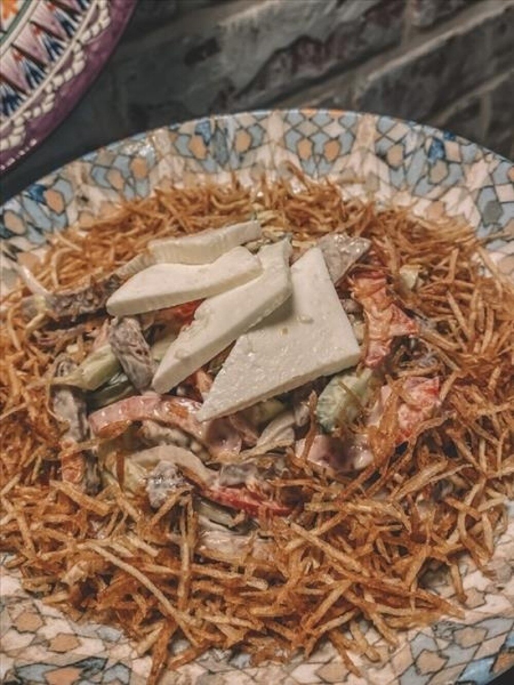 Говяжий язык, болгарский перец, томат, огурец, лук красный, лист салата, брынза, майонез, соевый соус. Украшается картофелем пай