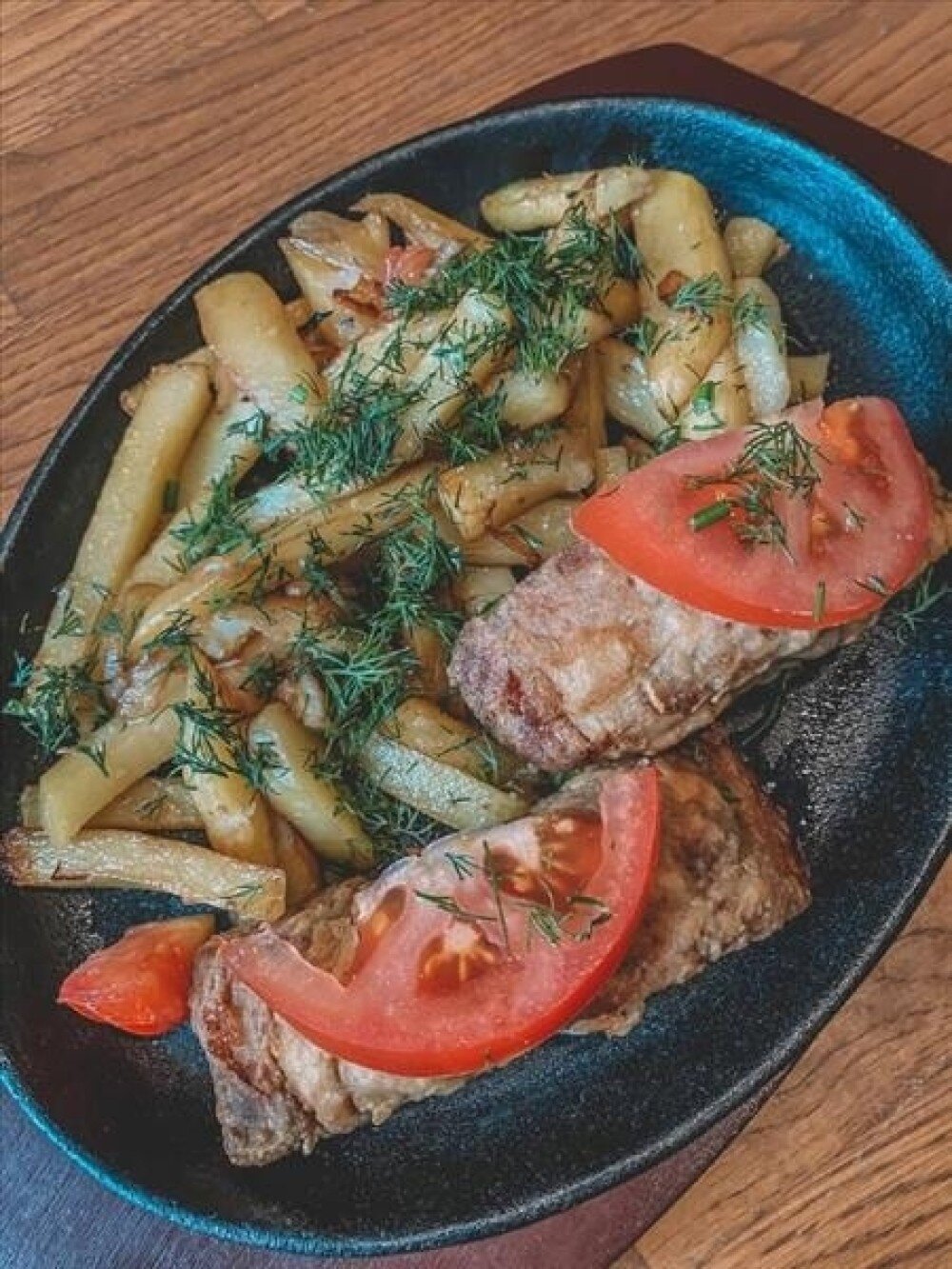 Сазан, жаренный на сковороде с картофелем и репчатым луком. Украшается свежими томатами и зеленью