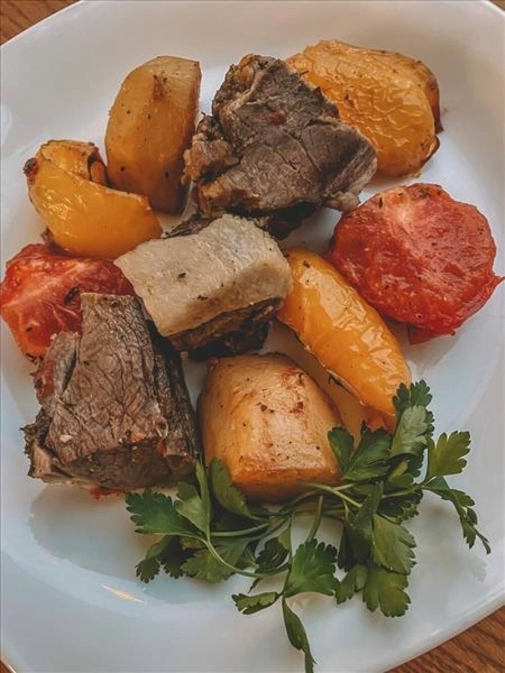 Тушёная баранина с картофелем, болгарским перцем и помидорами