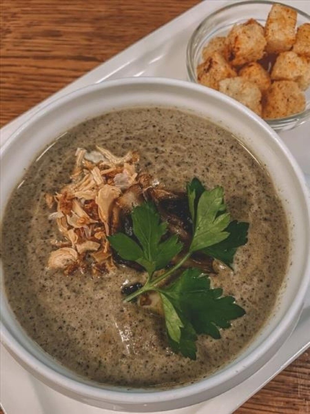 Нежный классический суп с насыщенным вкусом и ароматом шампиньонов с добавлением сливок. Украшается зеленью, подаётся с сухариками