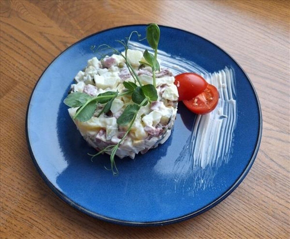 Говядина копченая, картофель отварной, яйцо перепелиное, горошек консервированный, огурцы маринованные, яблоки, лист салата, майонез