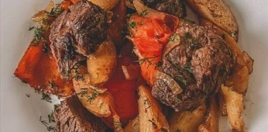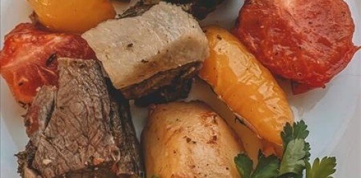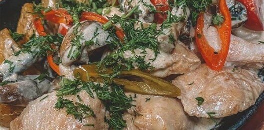 Сковородочка со свиной вырезкой и овощами в сливочно-грибном соусе